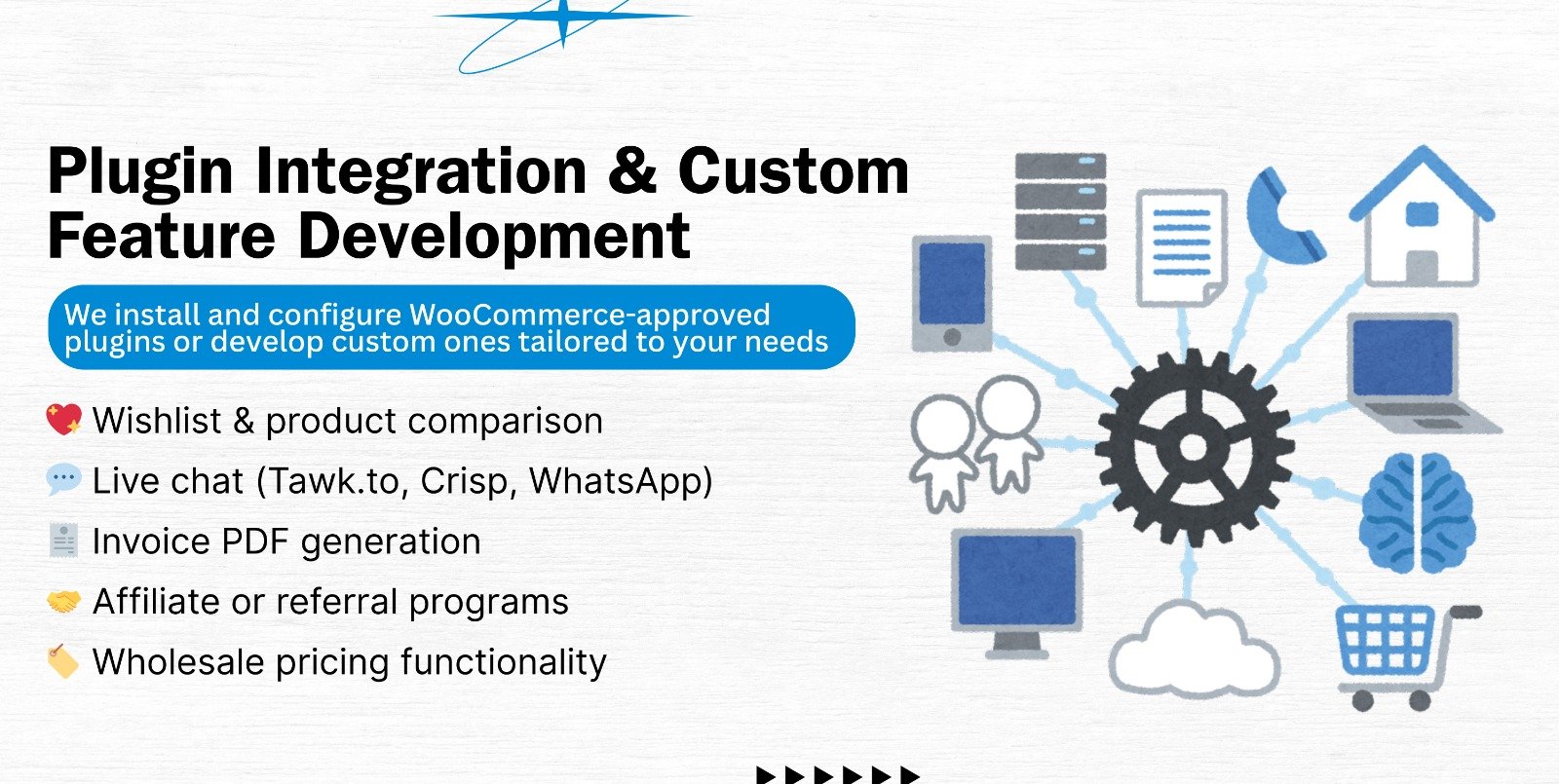 Need extra functionality? We install and configure WooCommerce-approved plugins or develop custom ones tailored to your needs. Examples: - Wishlist & product comparison - Live chat (Tawk.to, Crisp, WhatsApp) - Invoice PDF generation - Affiliate or referral programs - Wholesale pricing functionality