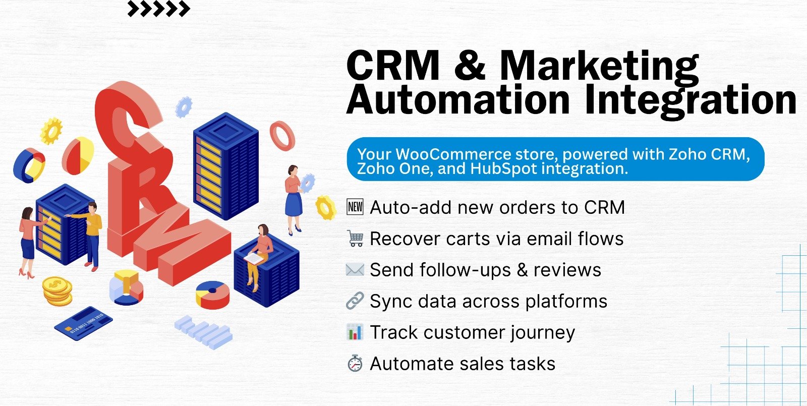 Your eCommerce site is just the beginning. We connect your WooCommerce store with Zoho CRM, Zoho One, HubSpot, or other tools to help you manage leads, automate follow-ups, and build long-term customer relationships. Examples of Automation: - New order triggers contact in CRM - Abandoned cart email workflows - Order follow-ups & review requests - Cross-platform data sync between WooCommerce and CRM